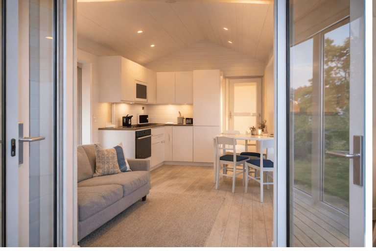 Varje stuga är utrustad med fullt kök, WC och dusch samt moderna bekvämligheter som diskmaskin, kyl och frys, mikrovågsugn, kaffebryggare och Smart TV med satellitbox. Egen parkering och fritt Wi-Fi ingår för en smidig och bekväm vistelse.